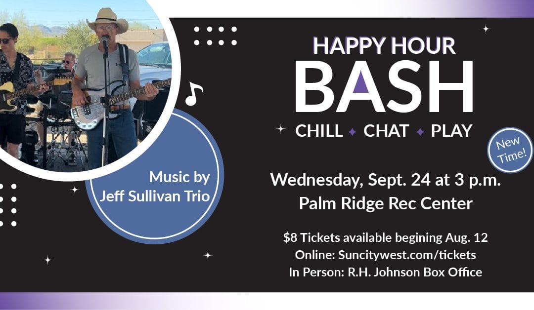 [Sun City West] Happy Hour BASH is returning to Sun City West at 3pm on Wenesday, September 24, 2025, with a performance by the Jeff Sullivan Trio at the Palm Ridge Recreation Center. (link)