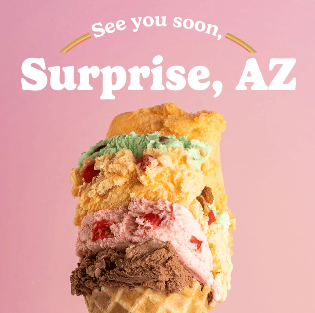 ~ A 100-year-old Chicago favorite is coming to the West Valley, as The Original Rainbow Cone plans to open its first Arizona location in Surprise, near Litchfield Road & Waddell Road. Known for its stacked, multi-flavor “rainbow” ice cream cones, the shop will bring a unique dessert experience to the area and add to the growing list of new dining options in Surprise. This location is scheduled to open on March 30th. (link & map)