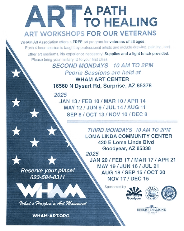 [Surprise] A unique art program is helping local veterans heal through creativity. âVeteran Art: A Path to Healingâ at WHAM Art Center offers free monthly workshops, covering everything from watercolors to sculpture, designed to promote emotional wellness and community connection. Open to veterans, active duty service members, and their families, the initiative is fostering resilience and camaraderie through the power of art. This event is held the second Monday of each month (Monday, July 14th) from 10am-2pm at the WHAM Art Center at 16560 N. Dysart Road, Surprise, AZ 85378.