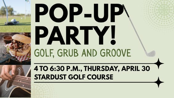 [Sun City West] The SCW Recreation Centers' Pop-Up Party is back and this time taking over Stardust Golf Course! Join us on Thursday, April 30, from 4 to 6:30 p.m. for this free event that includes: live music from The Jeff Sullivan Trio, food available to purchase from Mark's Best BBQ, beer/wine available for purchase, free putting contest - win range cards, rounds of golf and merchandise! Food and the putting contest start at 4 p.m. while the live music will begin at 4:30 p.m.